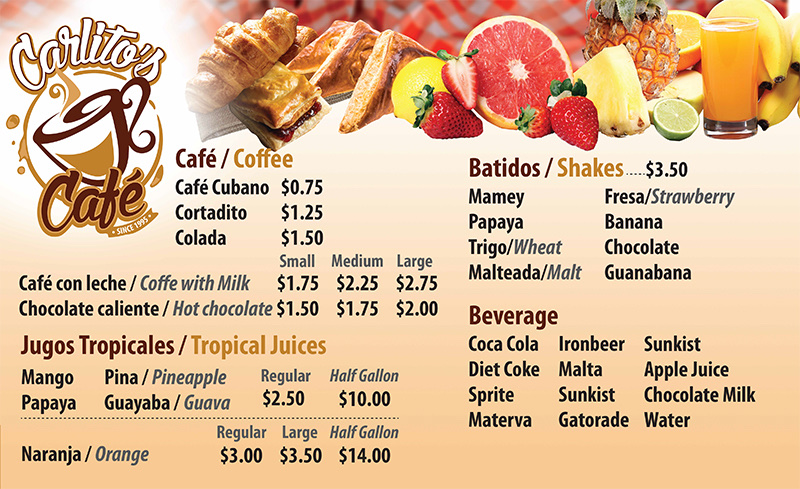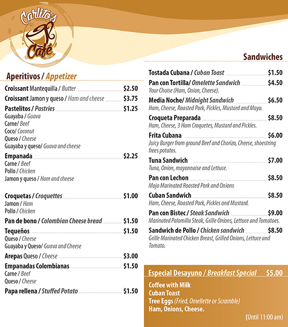 Welcome to Carlito's Café, a hidden gem in Miami's culinary landscape, located at 9045 SW 107th Ave. This cozy café offers an inviting menu that celebrates the rich flavors of Cuban cuisine. Start your visit with savory Pastelitos, featuring meat, cream cheese, and guava—all for just $1.35. The Pan con Bistec sandwich, laden with marinated polomilla steak and grilled onions, is an absolute must-try at $8.50. Don't miss the Café Espresso options, especially the coveted Colada ($1.40), which locals rave about.